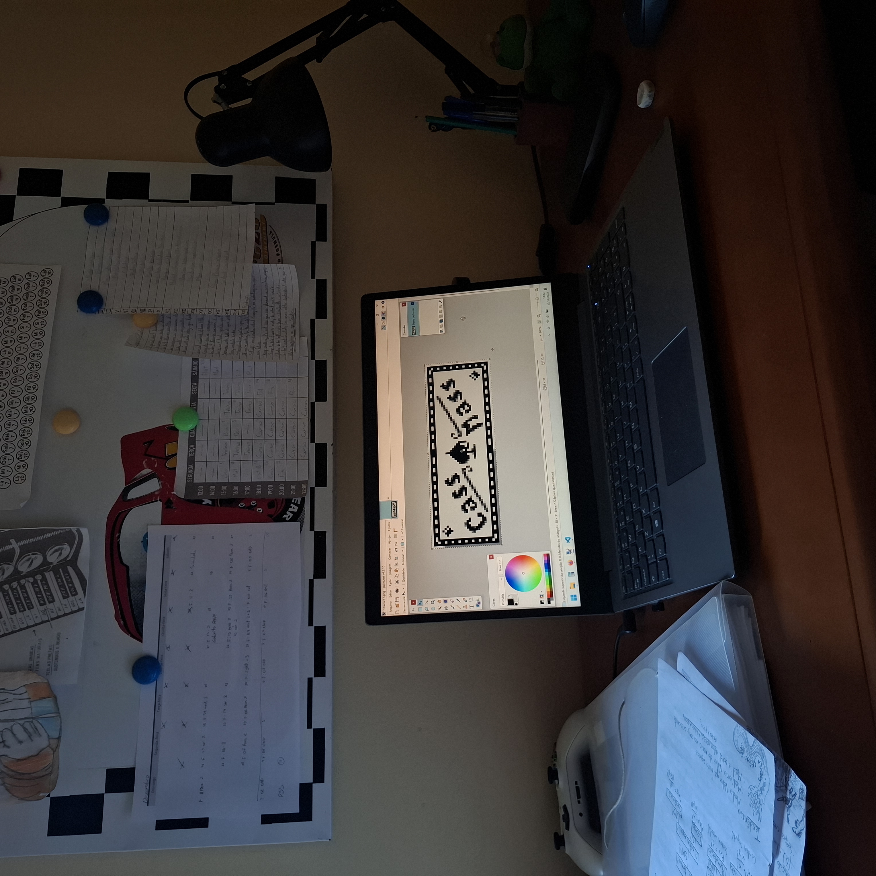 Friday: Today! A view of my desk. That's where all the things I say come from and find their way to you. Onscreen, a frame of my site button that I've just made. Yes, those are Naruto and Lightning Mcqueen in the background. Old relics.